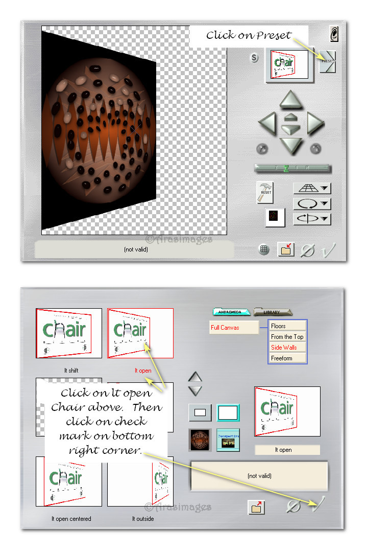 20. Effects/Andromeda/Perspective. Click on Presets in upper right corner. When box appears, select lt open/Chair and then click on the check mark in lower right corner. Click on the check mark once again. See settings below.