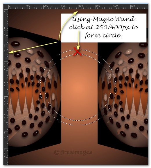26. Using Magic Wand set to Tolerance 3/Feather 0/Outside, click in upper center at 250px by 400px to form an activated circle.