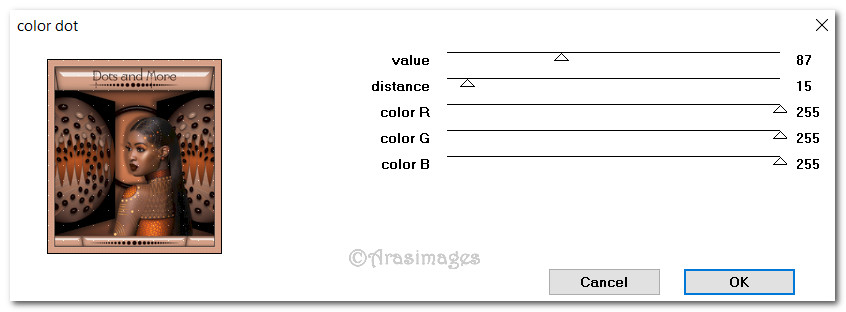 Unzip the materials into a working folder you have created on your desktop named Dots and More. Please duplicate and close original tubes using the copies for your work so you will not lose the originals. Place Selection in your PSP Selections folder. Export all brushes into PSP Files/Brushes. Click on the AlienSkin/Eye Candy 5 Impact/ArasOrganic.f1s file and it will automatically go into your proper folder ready to use. Export the Dots.png file into your PSP/Brushes folder. It is assumed you have a working knowledge of PSP to follow these directions. The plugins Flaming Pear/Flexify 2, AlienSkin/Eye Candy 5 Impact/Glass, Penta/dot and cross and Andromeda/Perspective are used in this tutorial. I have used PSP2019 for this tutorial but other versions may be used.