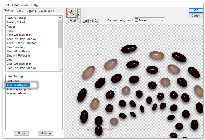 17. Effects/AlienSkin Eye Candy 5: Impact/Glass. Choose ArasClearOrganic under User Settings. Click OK.