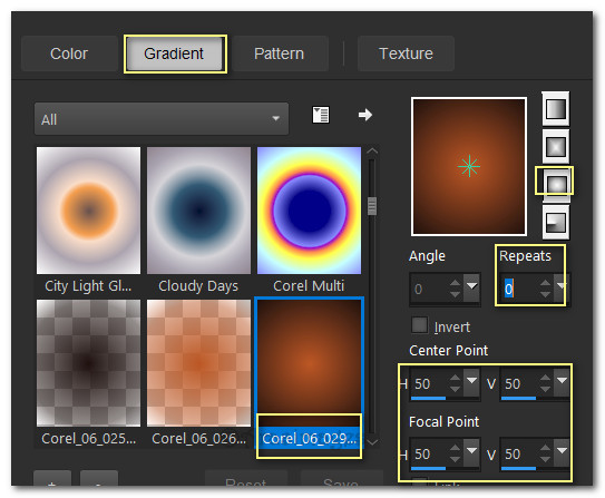 1. In Materials Palette, set Foreground to #d39a7f, Background to #130503. Create a Gradient using Corel_06_029_foreground/background, Sunburst, Angle/Null, Repeats 0, Center Point/Focal Point all set to 50.