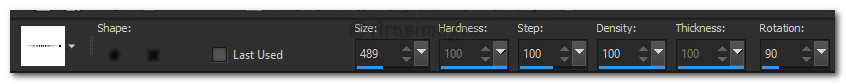 43. Layers/New Raster Layer. From tool bar select Paint Brush tool. Choose Stalks7, size 489, Rotation 90 and right click with Background color #130503 below the words. Erase the large dot on the right of Stalks7. Adjust both so they fit nicely on the top bar.