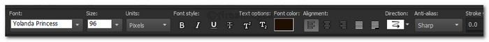 41. Using tool bar find the Text tool. Select text Yolanda Princess, Size 96, Font color #130503. Type out the words "Dots and More". Convert to Raster Layer.