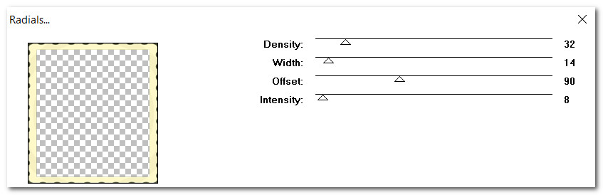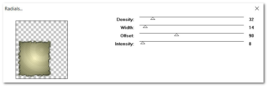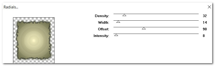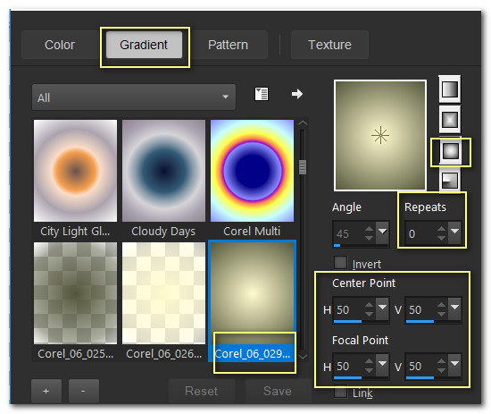 1. In Materials Palette, set Foreground to #fff9c9, Background to #494c30. Create a Gradient using Corel_06_029_foreground/background, Sunburst, Angle Null/ Repeats 0, Invert unchecked, Center Point at 50/50 and Focal Point set to 50/50.