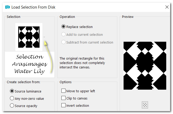 9. Selections/Load/Save Selection. Load Selection from Disk. Find Selection ArasimagesWaterLily from drop down. Load.
