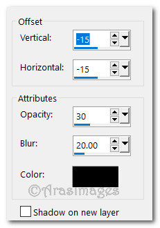 40. Effects/3D Effects/Drop Shadow. Vertical -15, Horizontal -15, Opacity 30, Blur 20, color #000000.