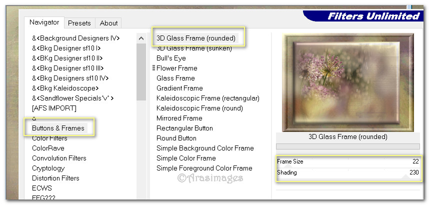 9. Effects/Filters Unlimited/Buttons & Frames/3D Glass Frame (rounded). Change Frame size to 22. Apply.