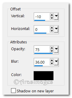 14. Effects/3D Effects/Drop Shadow. Vertical -10, Horizontal 0, Opacity 75, Blur 36, color #000000.