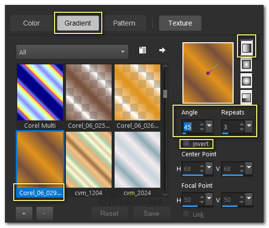 1. In Materials Palette, set Foreground to #de8a0e, Background to #6d4430, Corel_06_029 foreground/background, Linear at Angle 45/Repeats 3, Invert unchecked, Center and Focal points null.