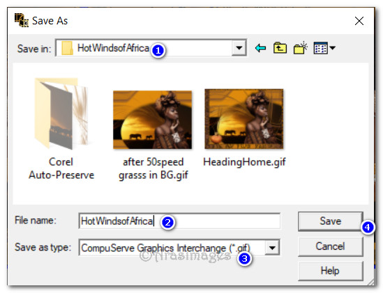 33. Now we will save our work. File/Save As. When the SaveAs box appears, name where to Save it in, Give your work a file name (Hot Winds of Africa) and leave Save as type as .gif. Click Save.
