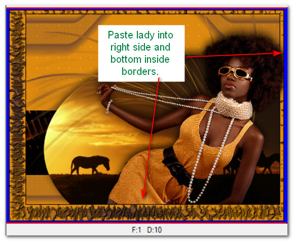 28. Working on main image/Edit/Propagate Paste. File/Open jet-woman with DS.psp file. Copy. Right click in first frame of main image/Paste/Into Selected Frame, placing her in the right side of image and inside the 2px border on bottom. Left click to set into place.