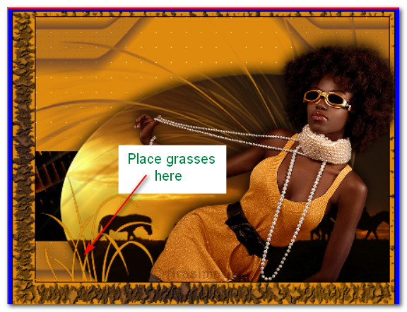 29. File/Open GrassesAS.psp. Copy. Right click in first frame/Paste/Into Selected Frame of main image in bottom left corner inside black 2px borders. Left click to set into place.