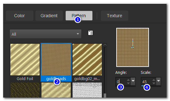 47. In Materials Palette, switch from Gradient to Pattern. Foreground Goldbeads/Angle 0/Scale 45.