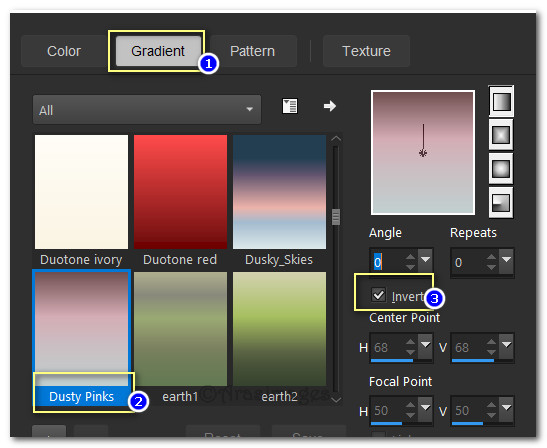 1. In Materials Palette, set the Foreground to Gradient selecting Corel_06\Dusty Pinks.PspGradient. Set Background color to #f1efed. Invert checked, Center Point and Focal Point Null, Angle/Repeats both at 0.