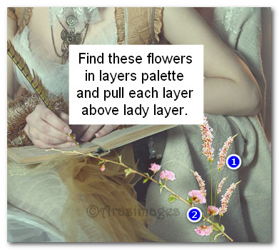 45. Close off Lady layer. Use the move tool to select the layers of flowers in right corner of image and pull each of those highlighted layers above layer of lady. Reopen Lady layer.