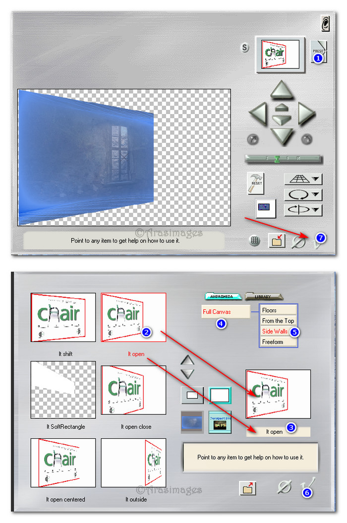 6. Duplicate. Effects/Andromeda/Perspective. Click Presets in upper right corner and in other areas indicated.