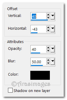 50. Effects/3D Effects/Drop Shadow. Vertical 40, Horizontal -43, Opacity 40, Blur 50, color #000000.