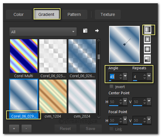 56. Create a Gradient in Materials Palette using Foreground #345e94 and Background color #e9e9e9, Linear, Angle 45/Repeats4, Invert unchecked. Center Point/Focal Point null.
