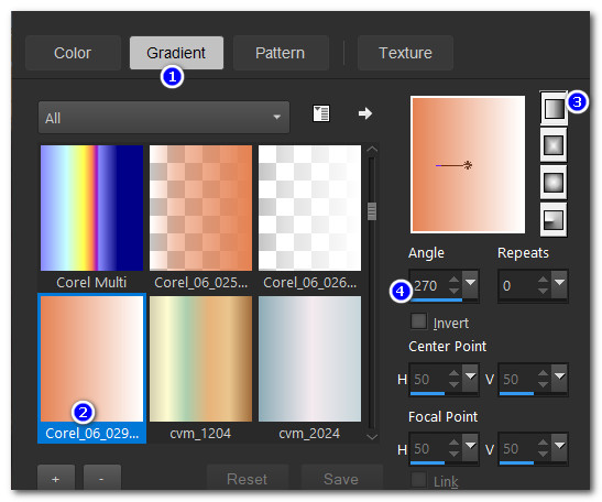 1. In Materials Palette, set Foreground to #fefefe, Background to #e37847. Create a Gradient using Linear set to Angle 270/Repeats 0. Select Corel_06_029. Invert and Center and Focal Points all at Null.
