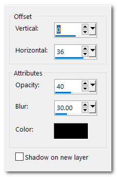 26. Effects/3D Effects/Drop Shadow. Vertical 0, Horizontal 36, Opacity 40, Blur 30, color #000000.