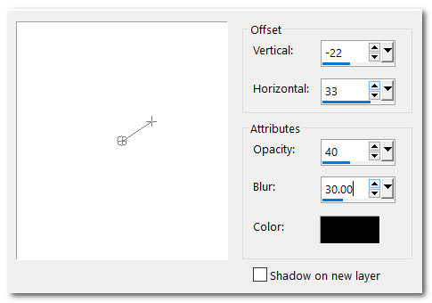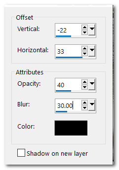 15. Effects/3D Effects/Drop Shadow. Vertical -22, Horizontal 33, Opacity 40, Blur 30, color #000000.