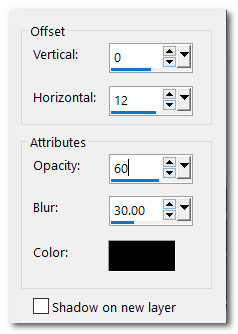 20. Effects/3D Effects/Drop Shadow. Vertical 0, Horizontal 12, Opacity 60, Blur 30, color #000000.