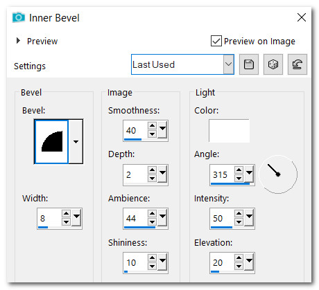 30. Effects/3D Effects/InnerBevel. Deselect.