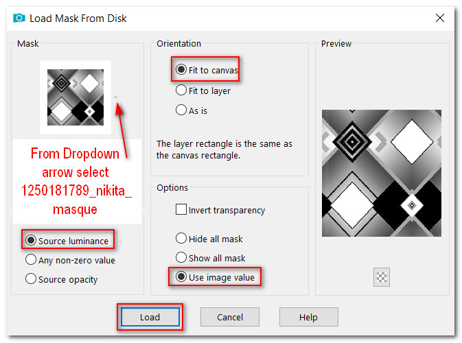 7. Layers/Load/Save Mask/Load Mask from Disk. From drop down arrow select 1250181784_nikita_masque. Load.