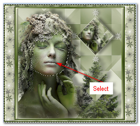 38. Using the Selection tool set to Point to Point, Feather 0, select around woman's face. Selections/Invert.