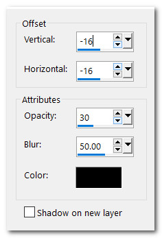 34. Effects/3D Effects/Drop Shadow. Vertical -16, Horizontal -16, Opacity 30, Blur 50, color #000000.