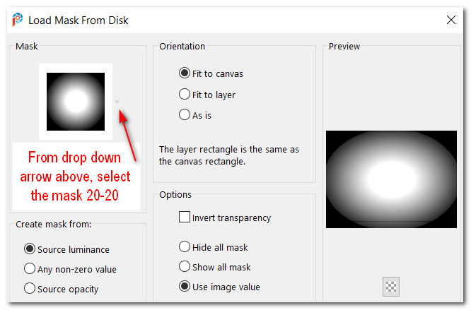 4. Layers/Load/Save Mask/Load Mask from Disk. From the drop down arrow, select Mask 20-20. Load. Merge/Merge Group. COPY.