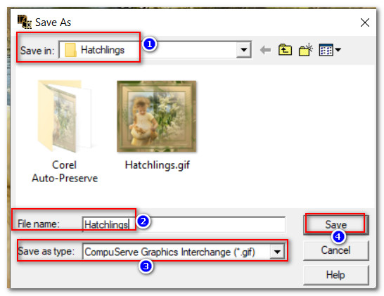 46. File/SaveAs. When the Save As box appears, name where you will save your file (folder you first made on your desktop named Hatchlings). Give the file a name and leave it set to save as a .gif file. Click Save.