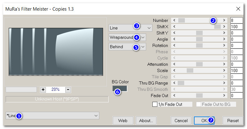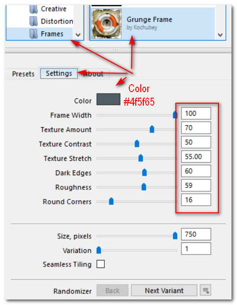 8. Effects/FilterForge6/Filter Forge. Under Tools/Options change Interface Opacity to 70, click OK. Select Presets/Frames/GrungFrame/Default under Settings. Under Settings change color to #4f5f65. Click Apply.