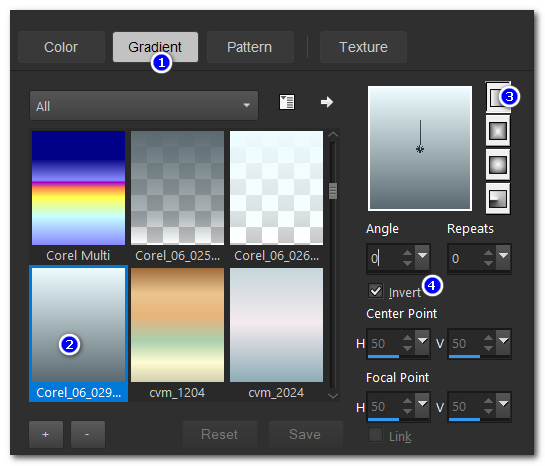 1. In Materials Palette, set color of Foreground to #ebfbff/Background to #4f5f65. Select Gradient/Linear/Corel_06_029 Foreground/Background/Invert checked. Angle and Repeats set to 0. Center Point/Focal Point both set to Null.