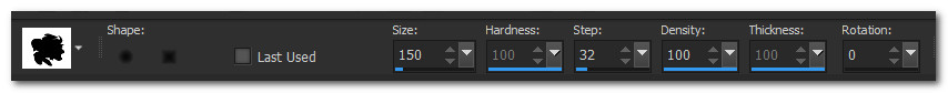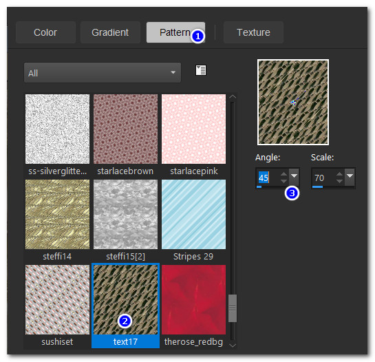 46. Change Materials Foreground to Pattern Text17/Angle45/Scale70, settings as seen below. Choose brush swirl2, set Size to 150 and left stamp once.