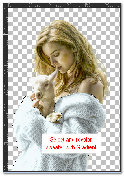 16. Open 156914730948_femmes_nikita.png of lady. Image/Mirror. Mirror Horizontal. Remove the watermark. Select around the sweater of lady. Change Background color back to #4f5f65. Using Color Changer set to Default, left click on sweater with Foreground Color.