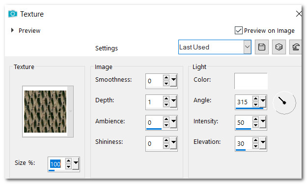 23. Drop down to Raster 2. Effects/Texture Effects/Texture/text17, color #ffffff.