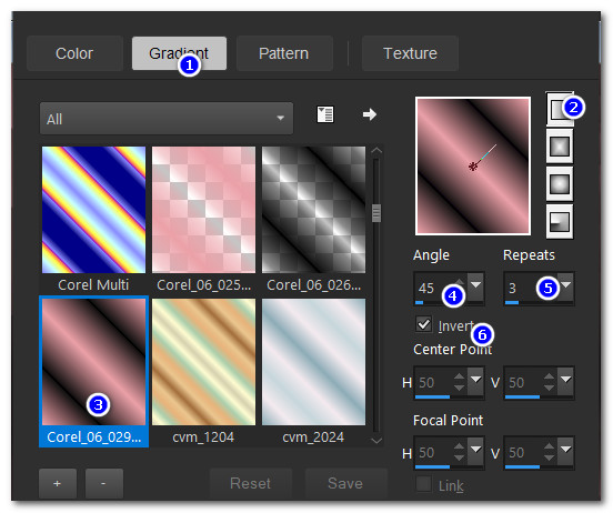 1. In Materials Palette, set color of Foreground to #000000/Background to #e998a0. Select Gradient/Linear/Corel_06_029 Foreground/Background/Invert checked. Angle 45 and Repeats set to 3. Center Point/Focal Point both set to Null.