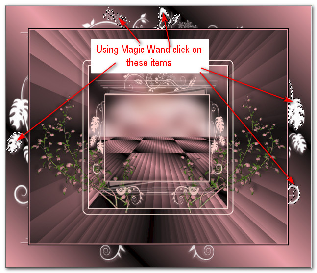 32. Change Background color to #ffd0c9. Using Magic Wand, select a few of the leaves, butterfly and flowers at top. Right click on the activated items to recolor them.