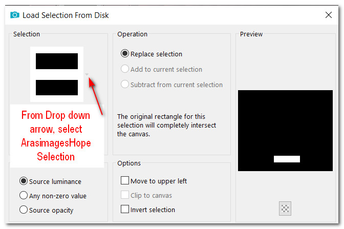 40. Selections/Load/Save Selection. Load Selection from Disk. From drop down arrow choose ArasimagesHope Selection. Load.