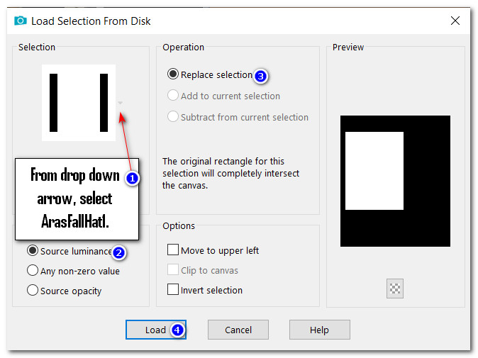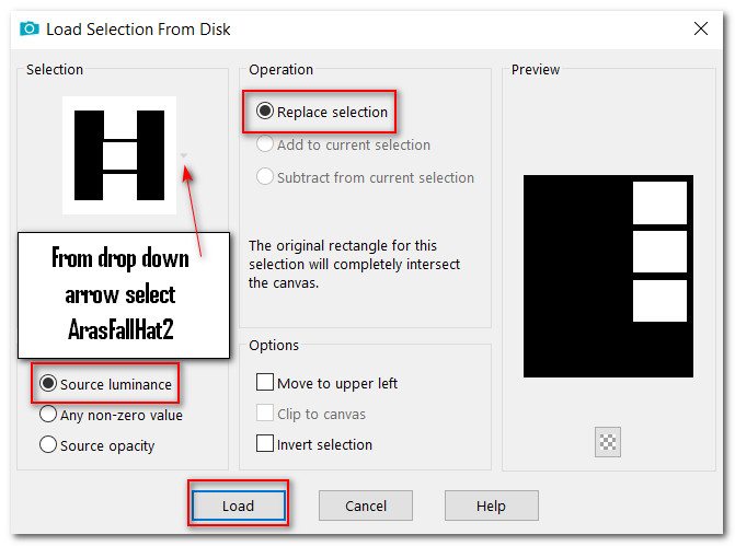 18. Selections/Load/Save Selection/Load Selection from Disk. From Drop down arrow select ArasFallHat2. Load.