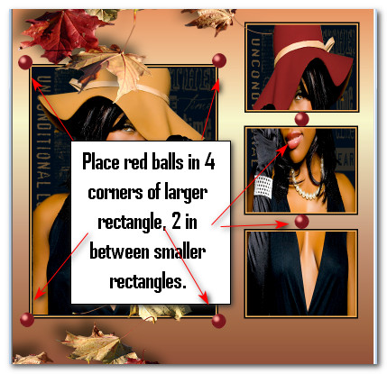 37. Right click in Layers Palette on the RedElement and drag to main image. Repeat until you have 6 layers of red balls. Place one on each corner of larger lady rectangle and one between each of the three smaller ones.