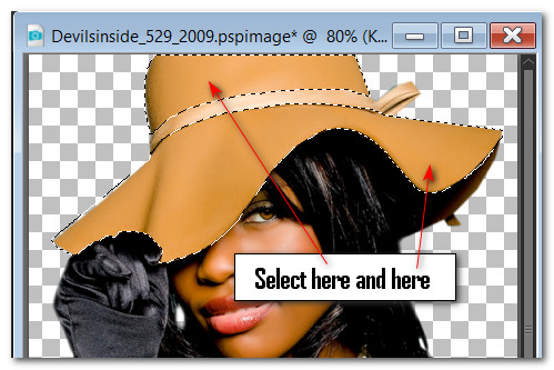 15. Using the selections tool set to Freehand Selection/Point to point/Add (Shift), Feather 0, carefully draw around the lady's hat omitting the ribbon on it.