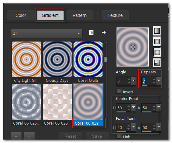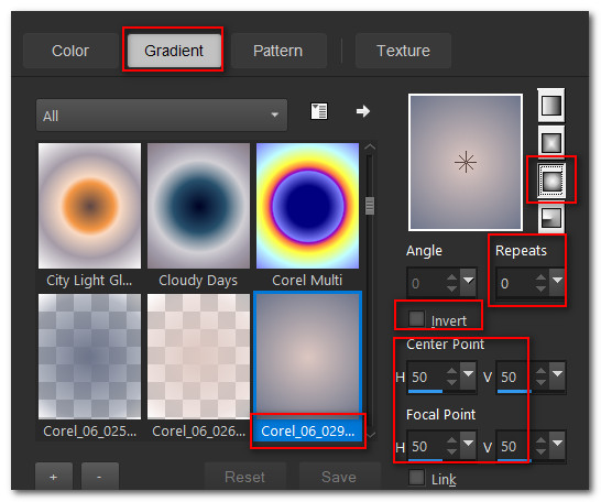 1. In Materials Palette, set color of Foreground to #ddc7c1 and Background to #6d758b. Set to Gradient/Angle null/Repeats at 0/Invert null/ Center and Focal Points all set to 50. Select Corel_06_029 and Gradient to Sunburst.