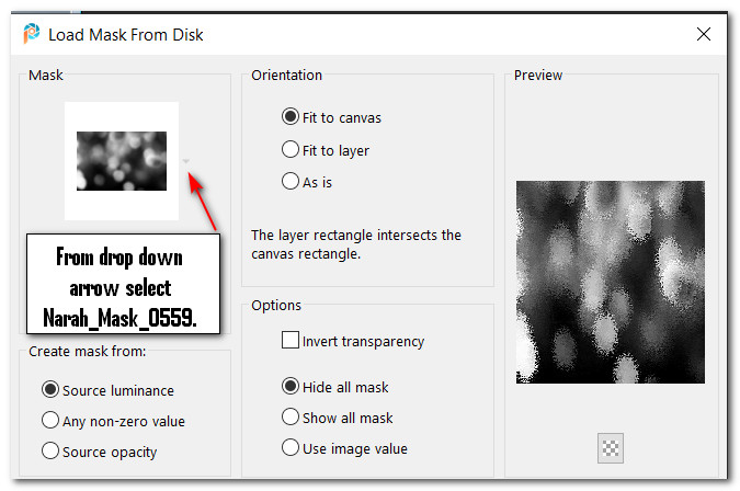 4. Layers/Load Save Mask/Load Mask From Disk. From dropdown arrow, select Narah_mask_0559. Load.