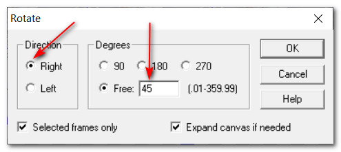 52. Animation/Rotate. Choose settings of Right and Free at 45 degrees. Selected Frames only. Click OK. Do this twice to tilt the "breath" toward the right.