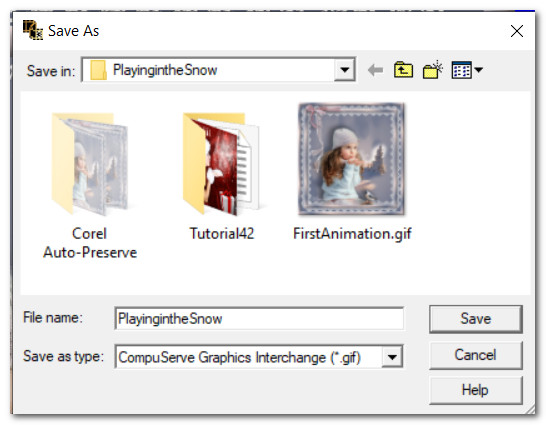 58. File/SaveAs. When this box appears, state where you are going to save your animated file, give it the name Playing in the Snow and leave the setting so it saves as a .gif file. Click on Save.