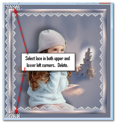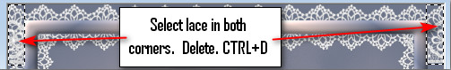 26. Place lace on left side of image. Line up the points of outer lace with inner lace. Use the Selection tool (Select) on excess lace and delete lace on top and bottom corners. Deselect. See below.
