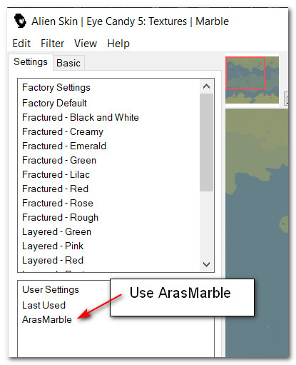 4. Effects/Alien Skin|Eye Candy:5|Textures|Marble. Click on ArasMarble. Apply.