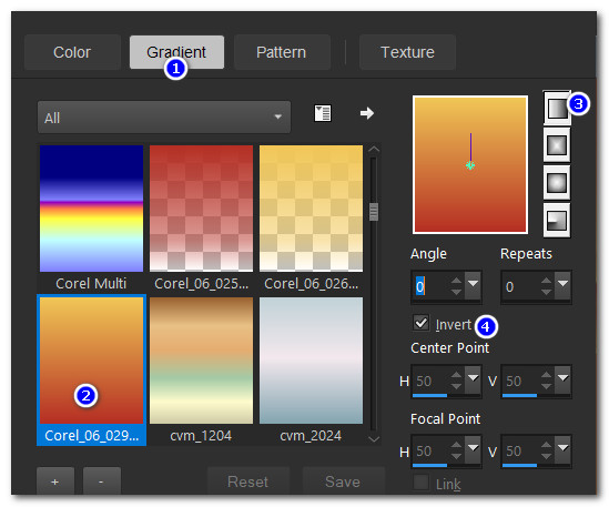 1. Open the Materials Palette. Set the Foreground color to #f0c656. Set the Background color to #b52f24. Set to Gradient tab, Style Linear, Angle to 0/Repeats 0. Invert checked.